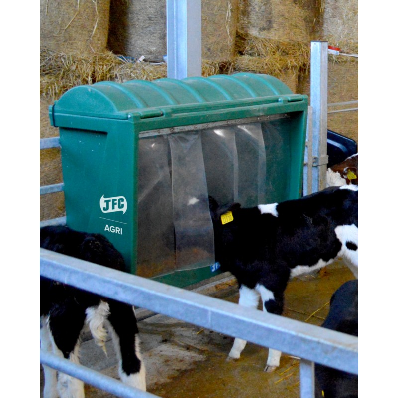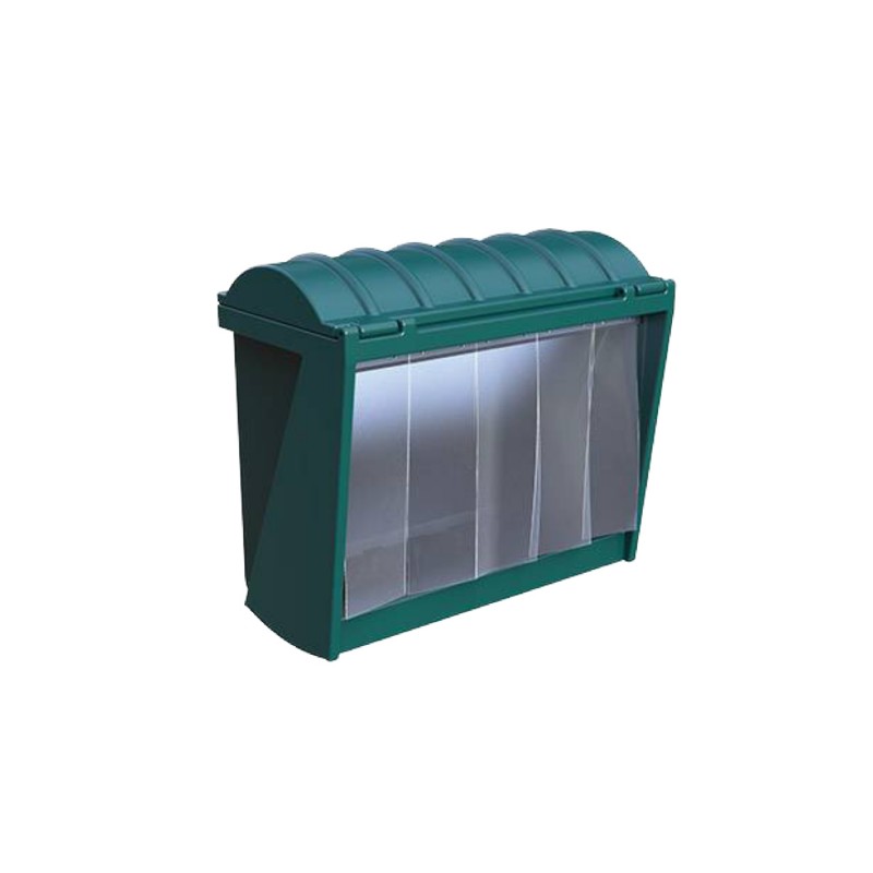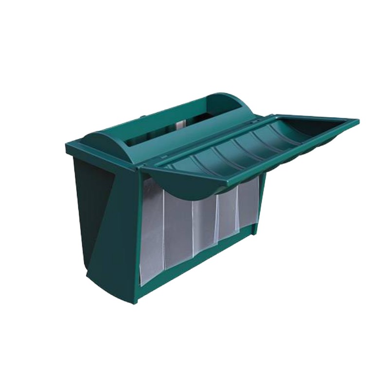 Podajnik paszy o pojemności 60 kg. Zawieszona na zawiasach pokrywa chroni przed ptakami i deszczem. Wyposażony w dwa mocowania przegrody z ocynkowanej stali. Utrzymuje suchą karmę podczas deszczu.